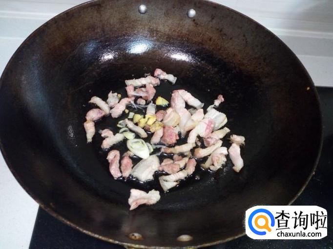 油热后倒入肉翻炒,放入葱,姜。