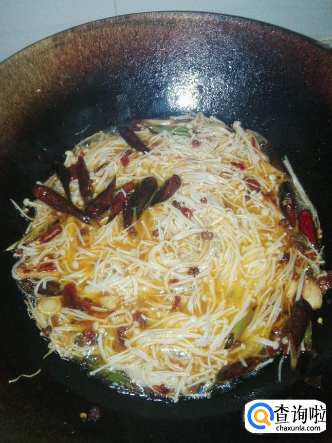 最后葱姜蒜、小米椒爆香后加入蒜蓉辣椒酱翻炒,最后把金针菇放入锅里面炒,等金针菇变软汤汁浓稠就可以了。