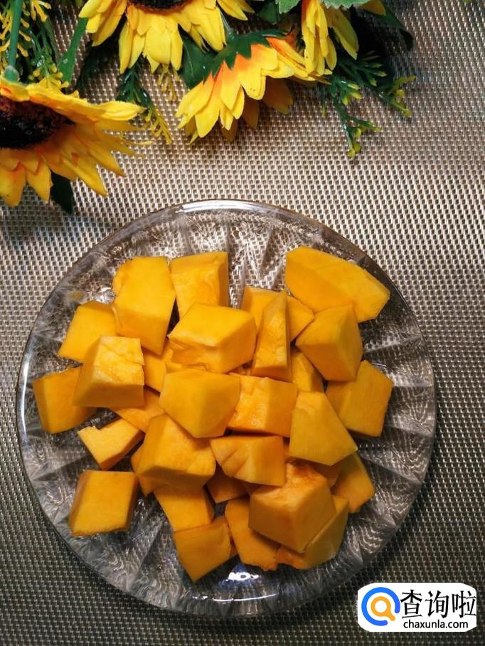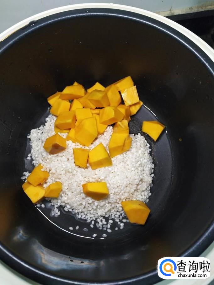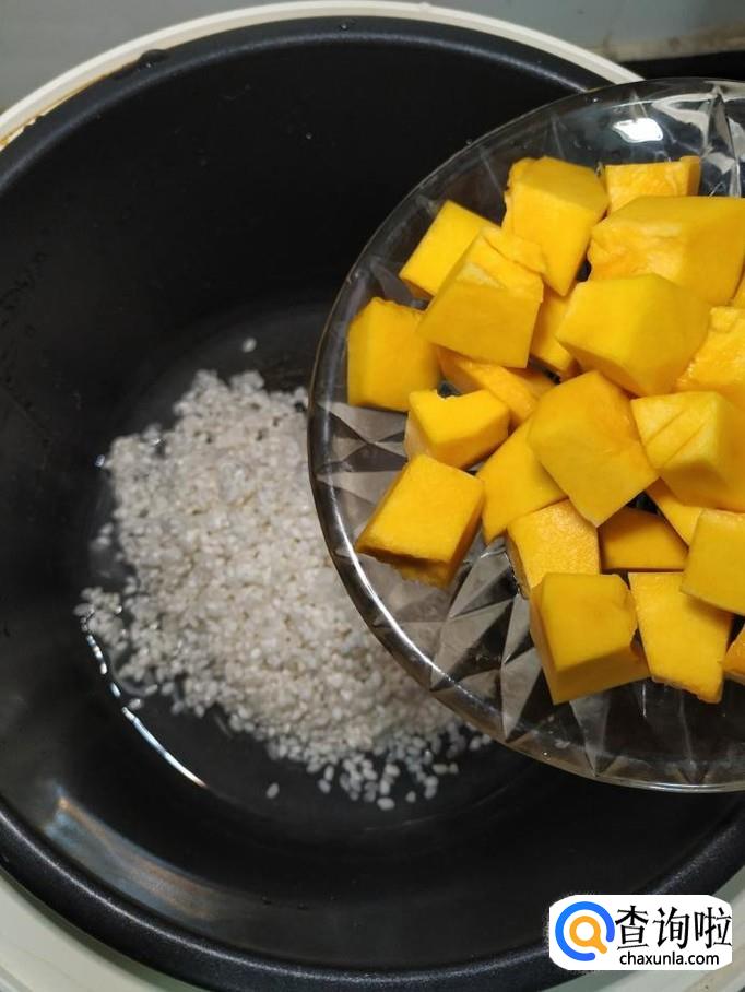将圆南瓜去皮,去瓤,切成小块儿,倒入锅中,南瓜切小一点,这样更容易熟,更容易和大米,糯米融合在一起。