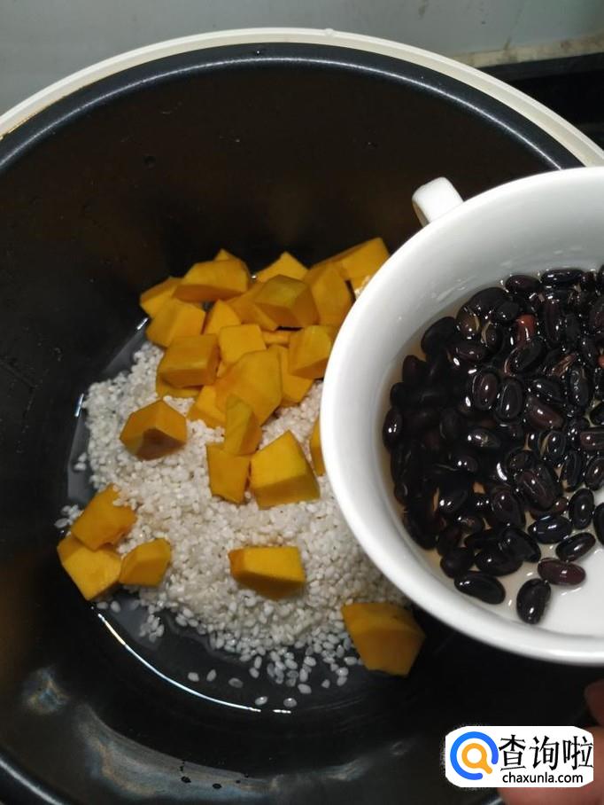 准备适量小黑豆,用清水泡一个晚上,泡过之后的黑豆特别容易熟;再准备适量圆南瓜;然后准备一半大米,一半糯米,用清水泡一个小时以上。