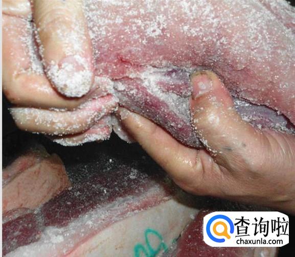 取一盆子,里面放齐配料,再把猪肉条放下去,撒上一层盐,腌制二三天天左右。