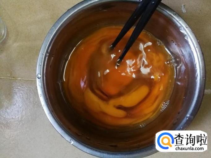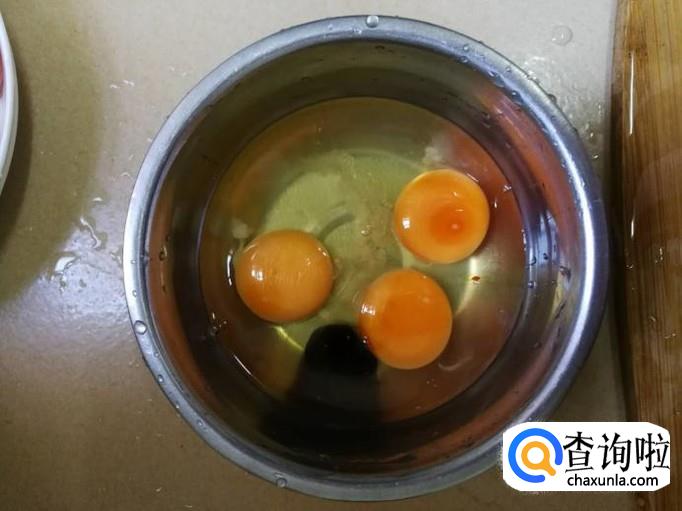 然后将鸡蛋打入碗中,加入少许的酱油进行调味,并用筷子将鸡蛋搅碎拌均匀。