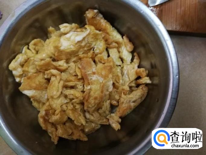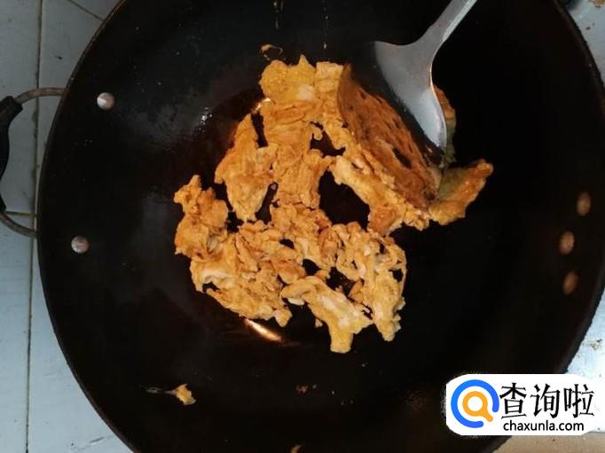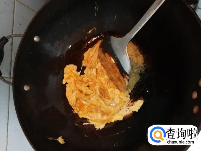 待油温上来后我们将搅拌均匀的鸡蛋倒入锅中翻炒,这里我们需要注意控制火候,如果喜欢吃鸡蛋鲜嫩的可以将火调小慢慢翻炒,这样鸡蛋就不会糊了。