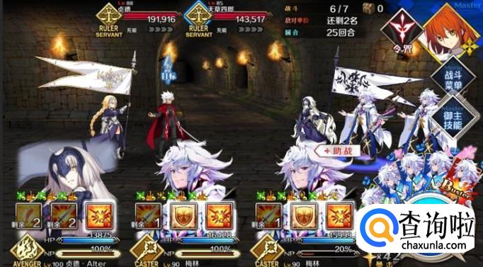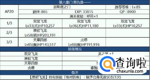第六关在第二面的时候可以准备一个杀阶单体,比如杰克准备好NP秒掉大龙,然后再使用黑贞秒掉两个裁定者。注意:第二面的大龙会无敌一回合,杰克的弱体强化非常适合。