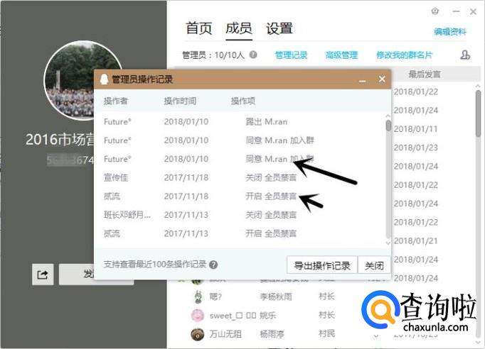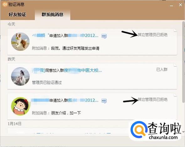 然后在验证消息面板的 群系统消息 里面就可以看到群管理员的审核和踢人记录了