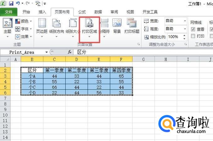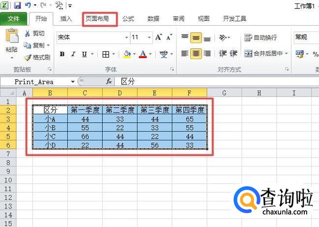 之后我们选中之前设置好的打印区域,然后我们点击工具栏中的页面布局;