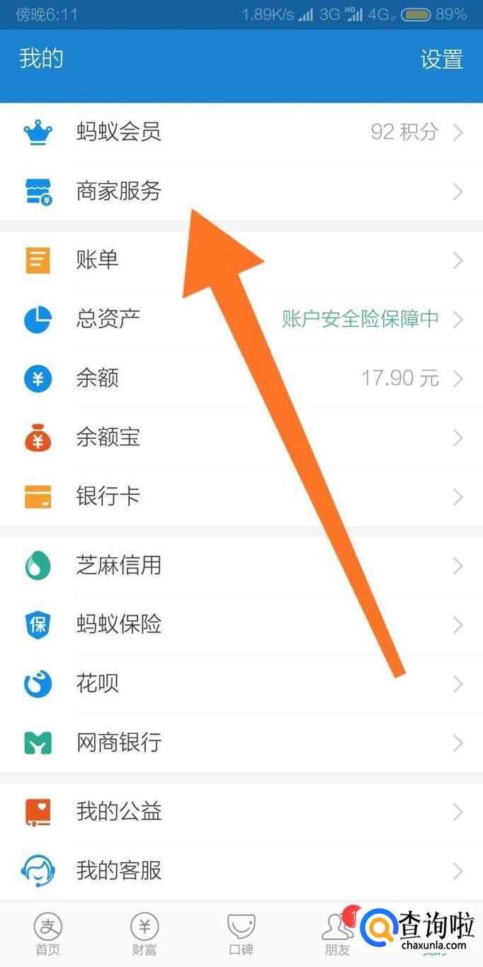 首先进入支付宝“我的”页面,点击进入“商家服务”选项。