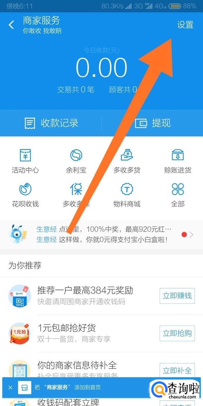 进入“商家服务”页面后,点击右上角的“设置”字样。