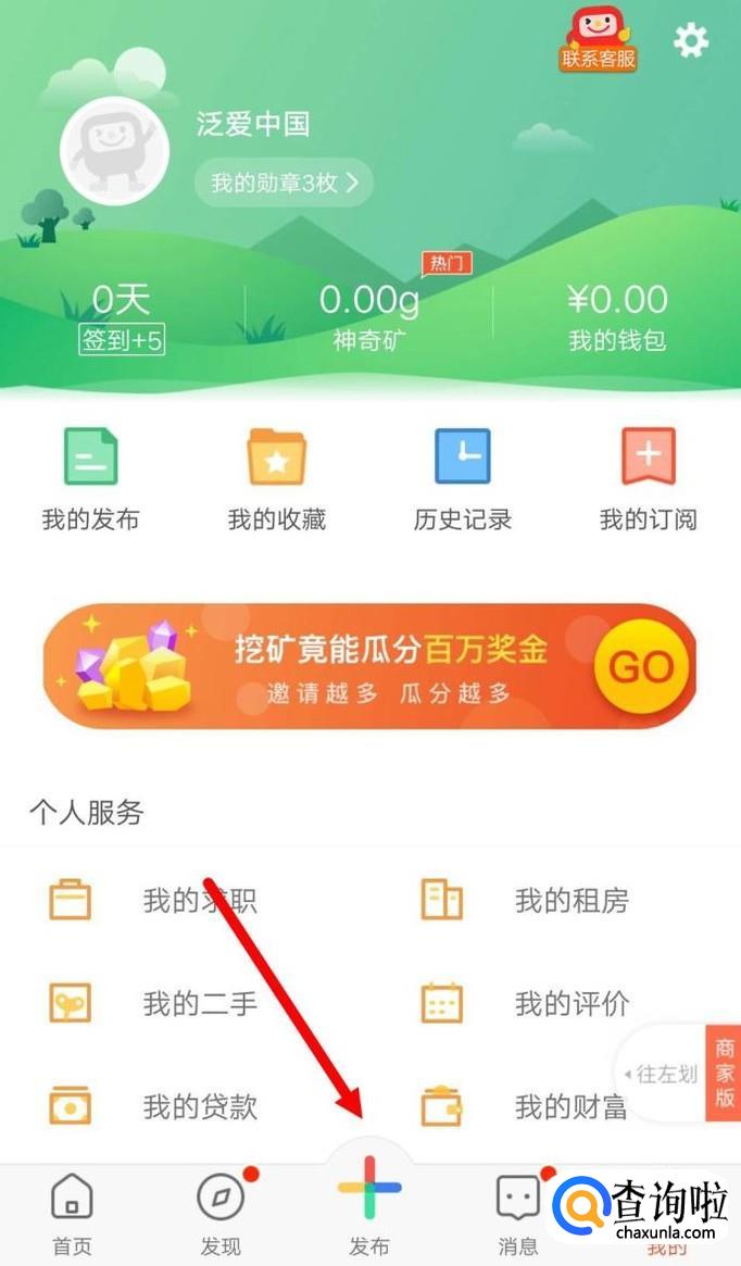 登陆58同城,然后点击中间部分的“+”号(发布),如下图。