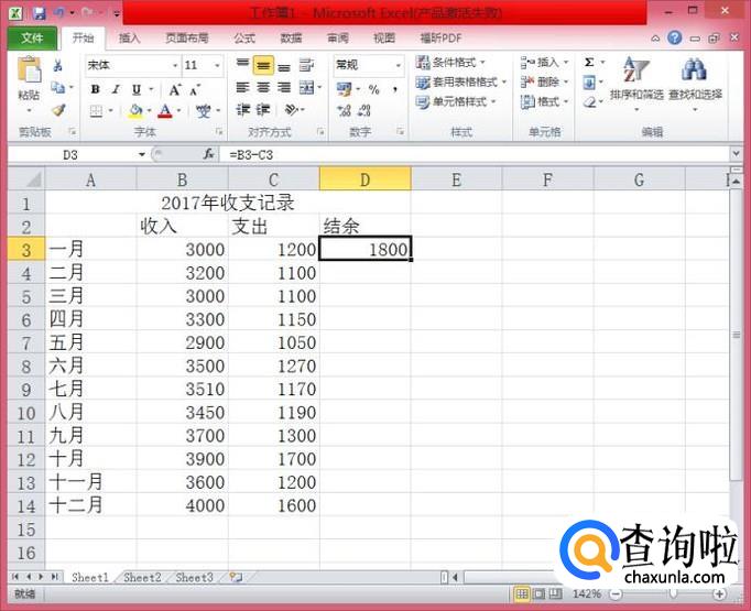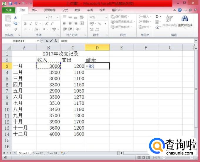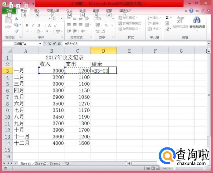 在继续用鼠标点击C3单元格,此时,D3单元格的内容为“=B3-C3"
