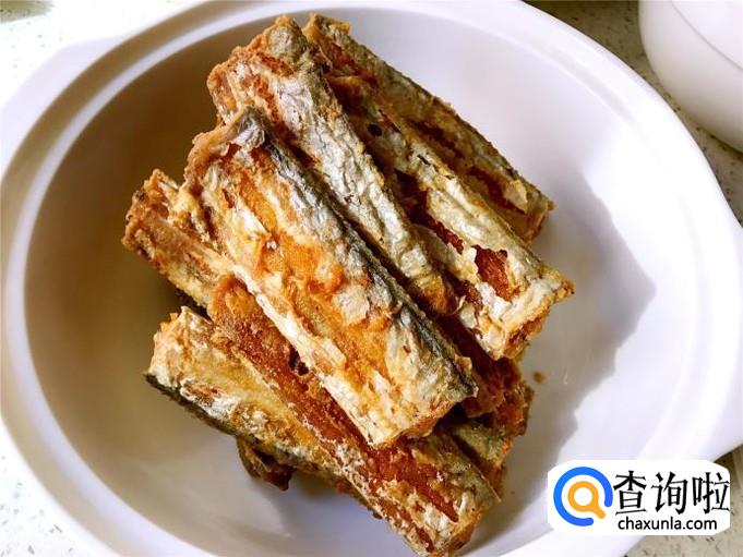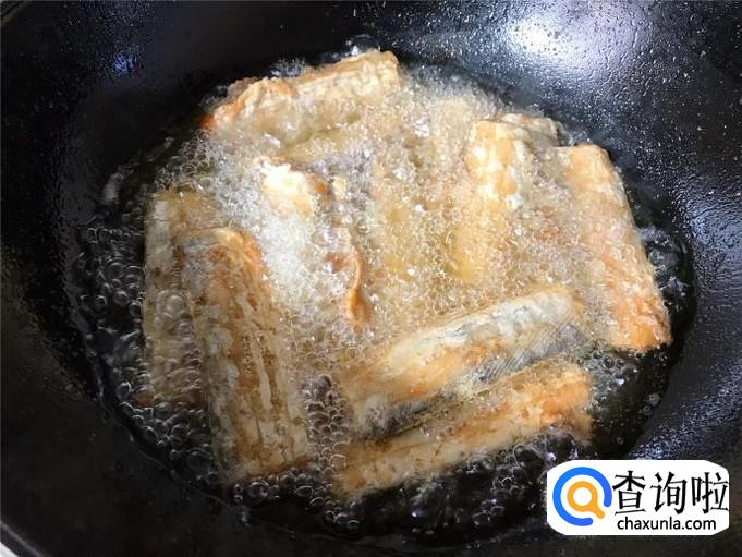 等带鱼的一面炸好之后,再给它翻个面继续炸。全部炸好了之后,先装盘子里备用。