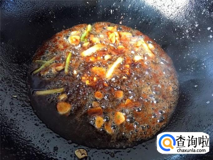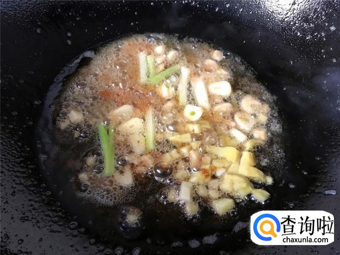 锅里留少许油,把姜、葱白和蒜放进炒出香味。