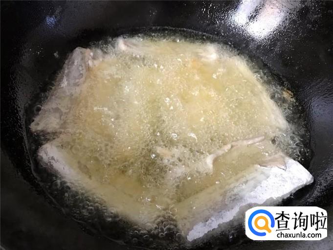 油锅烧至七八成热的时候,把带鱼轻轻地放入锅中炸。