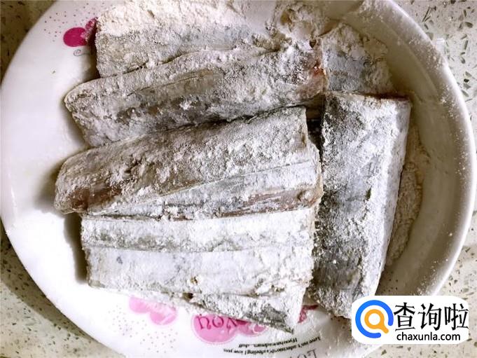 把沥干水分的的带鱼,包裹上一层干面粉。
