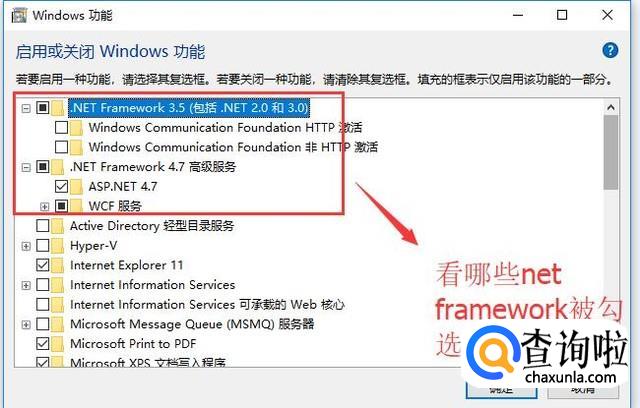 在弹出的Windows功能界面中你就可以看到哪些Net Framework被勾选了,勾选的代表已经安装了,如下图所示