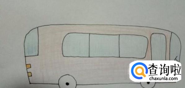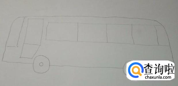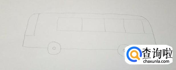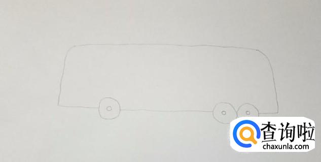 然后沿着车轮的中线画出公交车的车身(可以用直尺靠着画),公交车的车身是长方形,在四个角的地方可以画出一点弧度,这样更可爱。