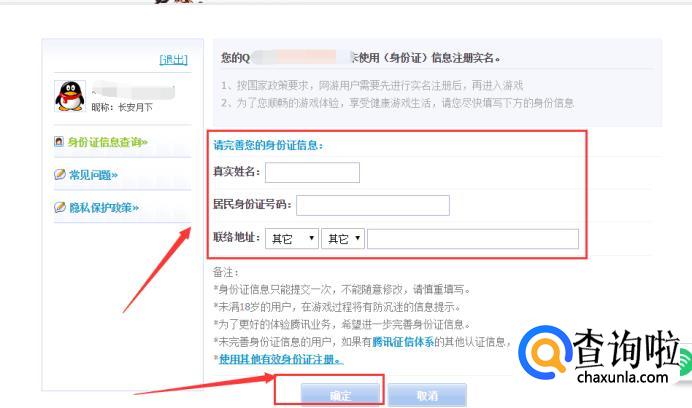 然后再完善身份证信息,包括真实姓名、身份证号码和联络地址,再点击下方的“确定”按钮。