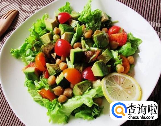 牛油果沙拉,选择自己喜欢吃的蔬菜,再把牛油果切丁,放在碗里,加入沙拉酱,搅拌均匀就好了,这很适合减肥人群。