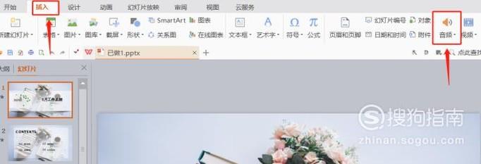 点击菜单栏上方的插入-音频