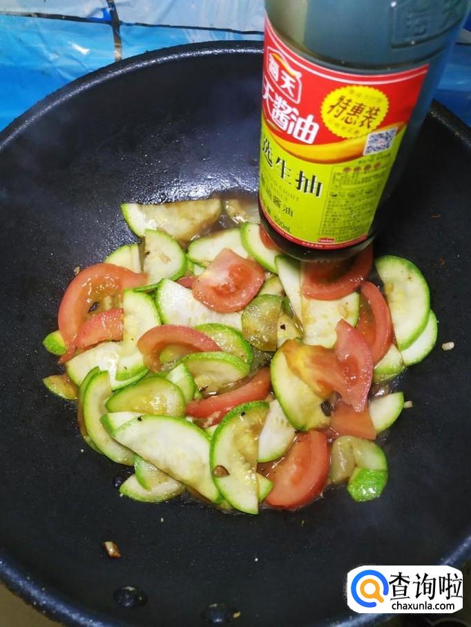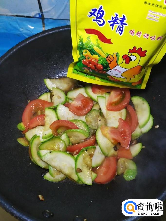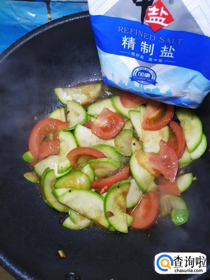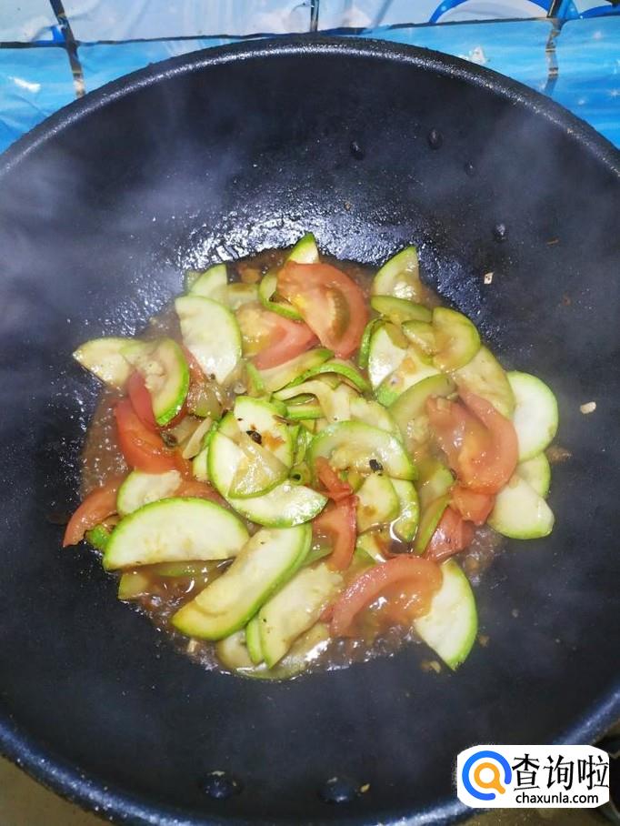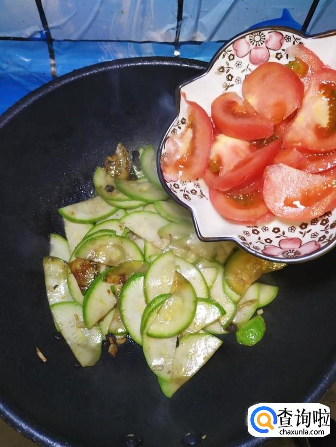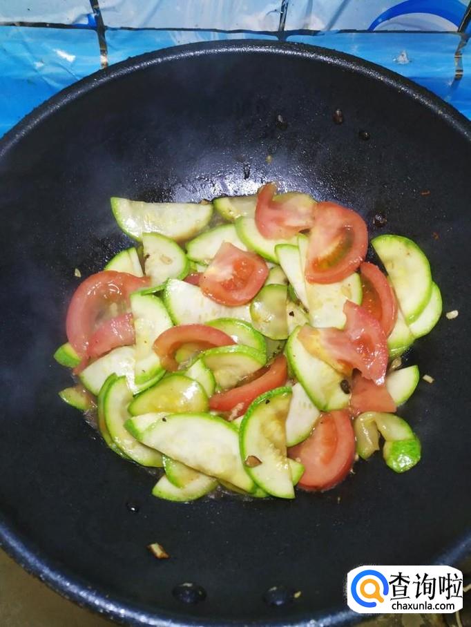 炒至西葫芦片开始变软之后,将西红柿倒入锅中,翻炒均匀。
