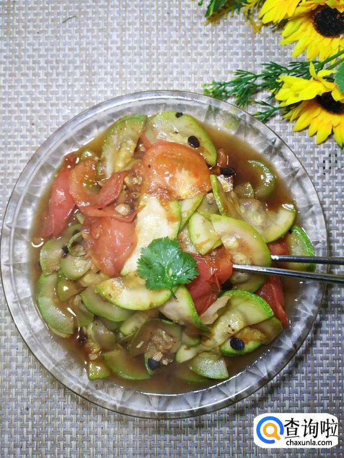 西葫芦适量,西红柿适量,豆豉适量,蒜适量,盐适量,鸡精适量,五香粉适量,生抽适量,陈醋适量。