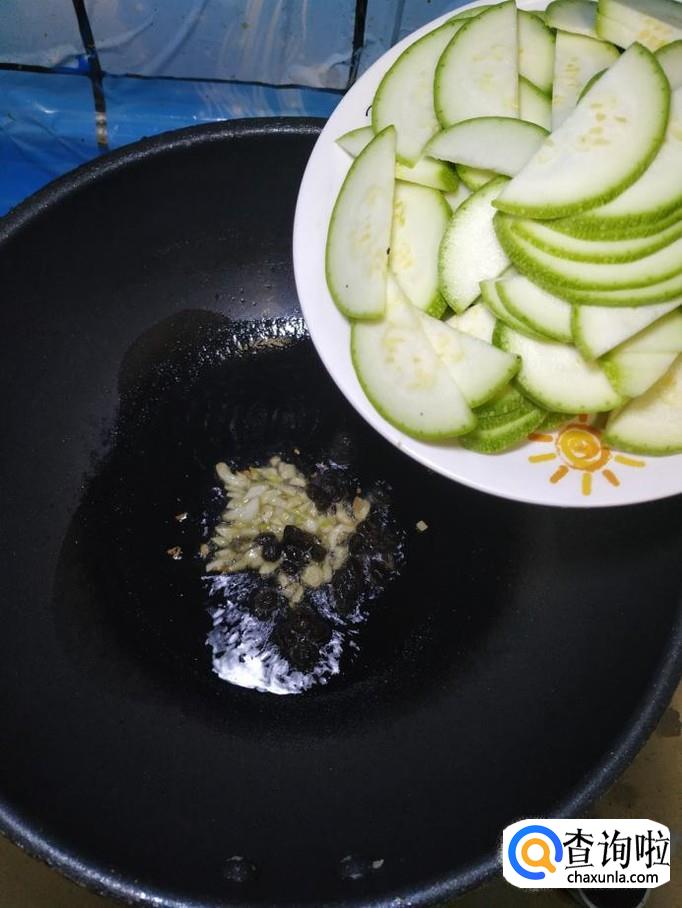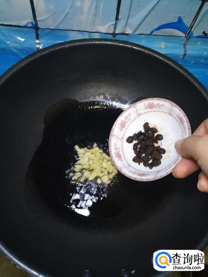 准备适量蒜,洗净后切片,炒锅中放入适量油,油热后将蒜片放入锅中炒香,然后将豆豉也倒入锅中炒香。