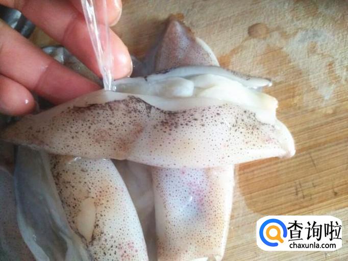 将海兔内脏翻出来,就会看到有一个黑黑的东西,这个是墨袋,一定要摘下来,不然炒出来的海兔颜色很难看的。