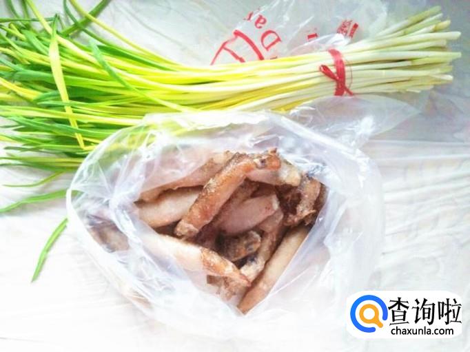 蒜黄从水里捞出来,控干水分,切成段。