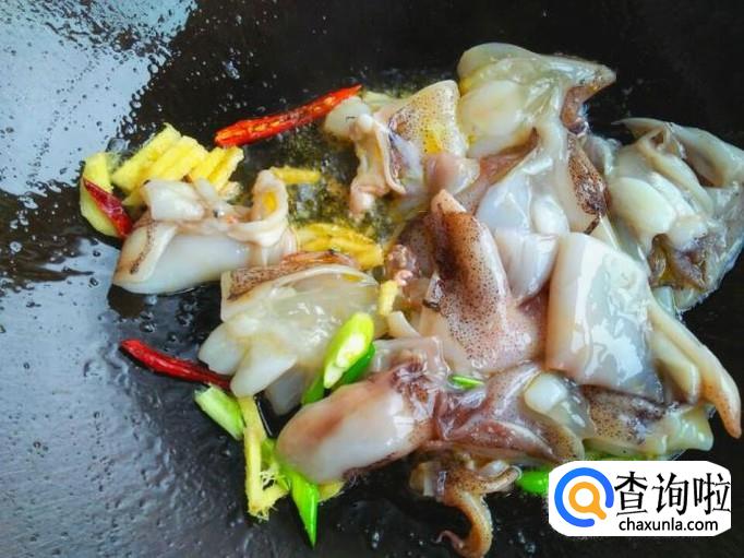 海兔炒到卷起的时候,说明海兔基本上炒熟了,加上一些食盐、生抽、白糖翻炒几下,让其入味。