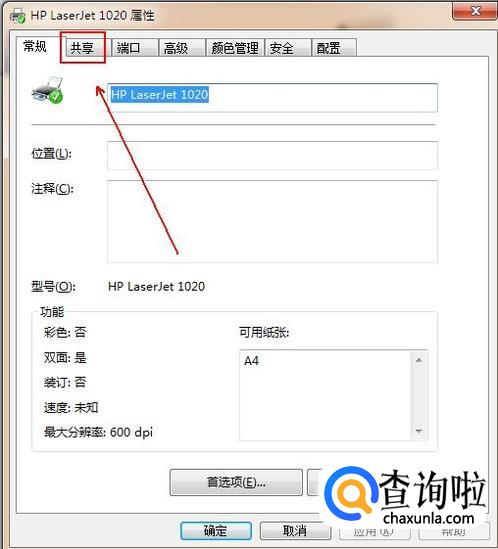 在“打印机属性”窗口中单击“共享”选项卡。