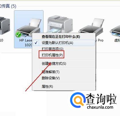 右击我们的打印机设备,在弹出的菜单列表中单击“打印机属性”选项。
