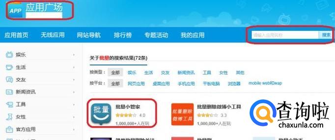 此时,我们就进入了微博的“应用广场”,如图所示,我们在搜索栏输入“批量”,点击搜索,就能搜到很多应用,我们点击“批量小管家”,然后下载安装。