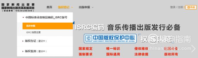 在顶端的首页栏目中点击 版权登记-中国标准录音制品编码-首次申报