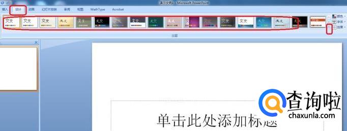 首先,我们打开PPT,点击菜单栏“设计”,就能看到很多的设计模板。如图所示,我们点击工具栏“主题”右侧下方的扩展按钮。