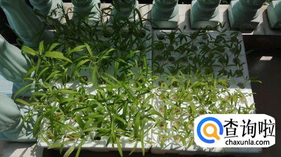 然后将空心菜的叶子都摘掉,只留下茎秆,能够让空心菜早期所需的营养少一些,便于成活,然后将茎秆插入到浮水材料的孔里,每一个孔的空心菜露出三四节即可。