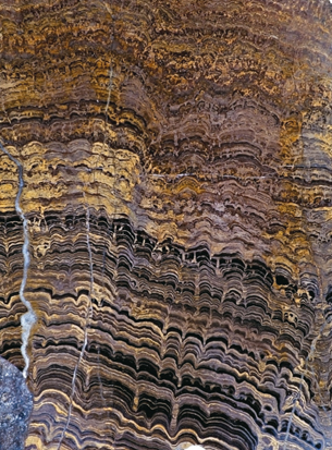 事实上,细菌还真的能保存为化石呢。自然界里有一个特别的生命类群,被称为蓝细菌,是地球上最早的生物之一。科学家曾在35亿年前的古老地层中发现了类似蓝细菌的化石。蓝细菌比大部分细菌都大,能够分泌一层薄薄的细胞壁。最重要的是,蓝细菌能够形成大的层状结构,这种结构被称为叠层石。叠层石是以蓝细菌为主的微生物在生长和新陈代谢活动过程中,附和沉淀无机盐或捕获矿物颗粒而形成的一种生物沉积构造。如果将这种叠层石磨成薄薄的片,在其中可能发现保存精细的蓝细菌和藻类化石。在中国河北张家口宣化至赤城一线,18亿年前的早元古代晚期的地层中含有大量的铁矿石,它们构成了宣龙铁矿的主体。在宣龙铁矿的铁矿石和伴生的叠层石铁矿石中,就曾发现了6个属的化石蓝细菌。