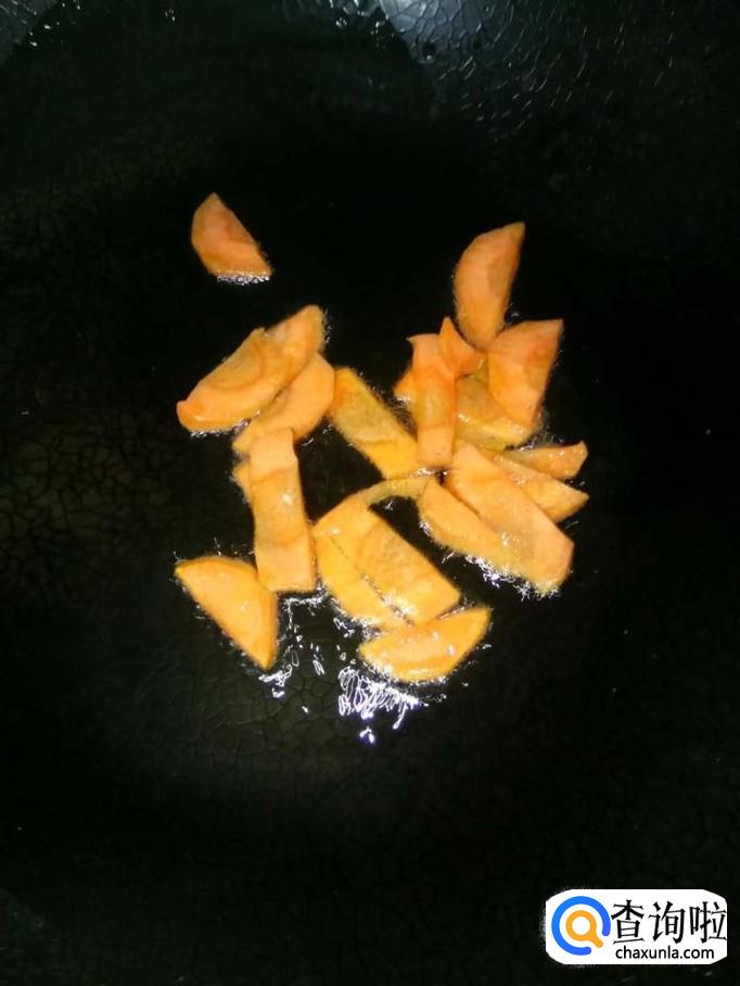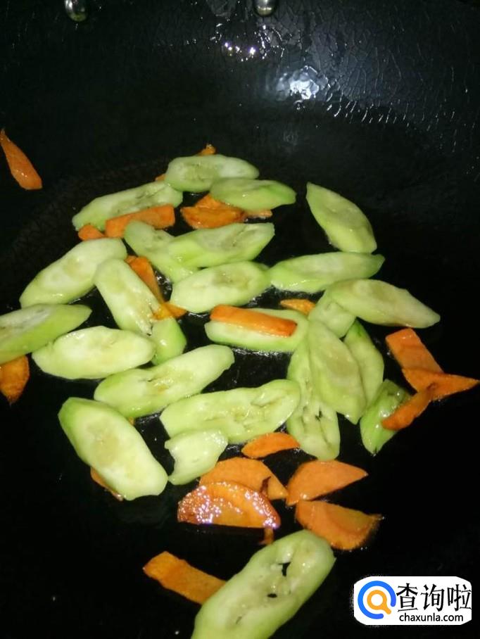 开火,加入适量的食用油,待油温升高后,将胡萝卜先下入锅里翻炒至熟(颜色略微变为浅黄色);将丝瓜下入锅里,一起翻炒;