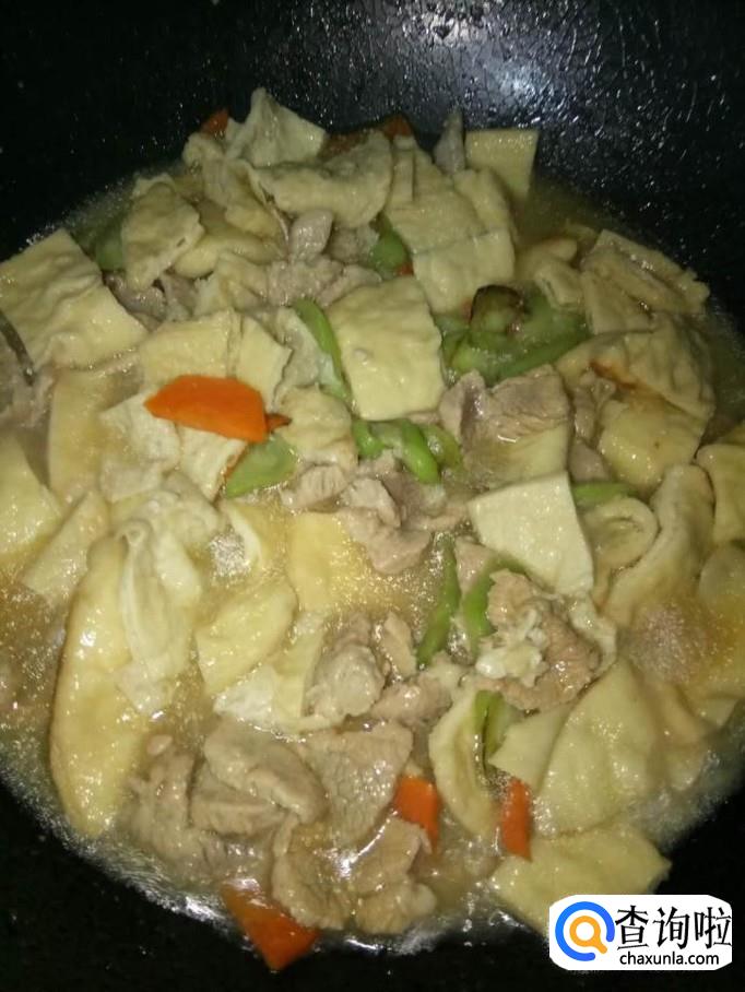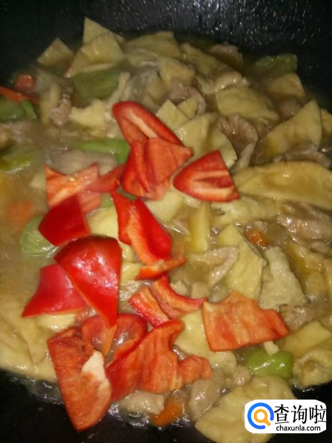 将瘦肉下入锅里,煮1-2分钟,将红椒下入锅里,再加入适量的盐和鸡精,调味好,翻炒均匀,就完成了!味道非常棒哦!