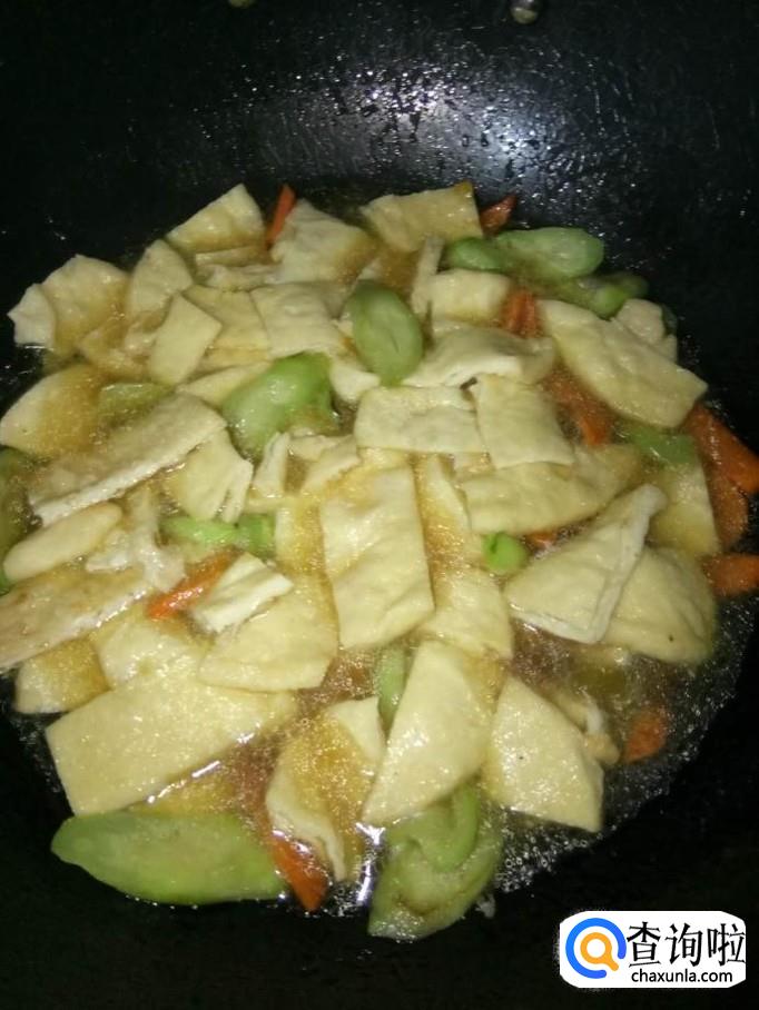将油豆腐下入锅里,马上加入适量的水、蚝油,煮开;