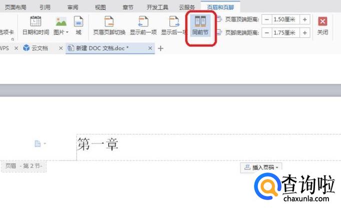 此时,双击第二页页眉区域,点击工具栏“同前节”按钮(没有点击之前有灰色底纹,点击之后底纹消失),就可以修改第二页页眉了,比如我们改成“第二章”。