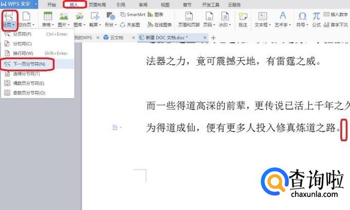 光标移到首页末尾,如图所示,点击“插入”,选择“下一页分节符”。