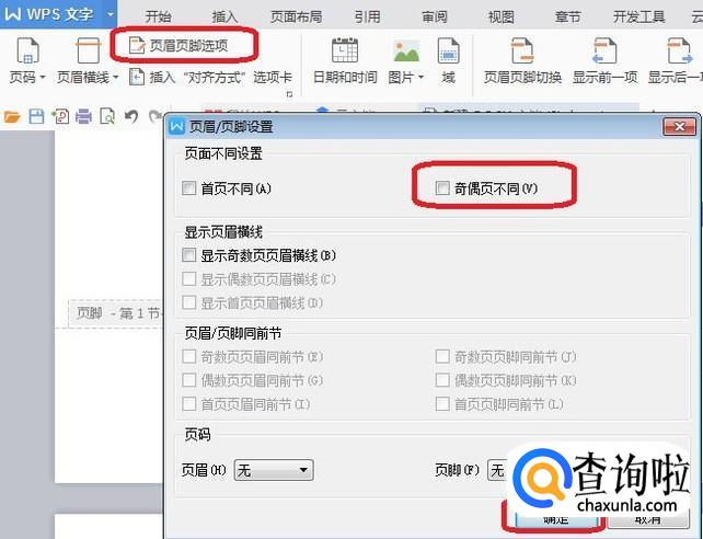 另外,我们还可以点击工具栏中“页眉页脚选项”,勾选“奇偶页不同”来设置不同页眉。勾选之后,只要设置相邻两页不同页眉就可以,不用插入分隔符了。