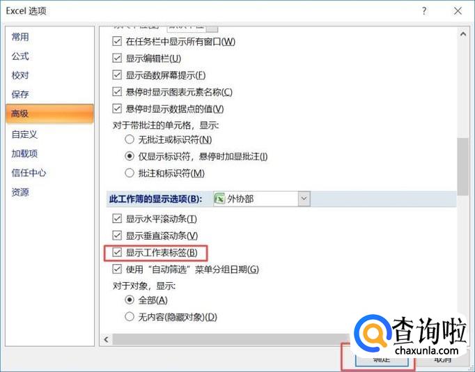然后我们将显示工作表标签勾选上,之后点击确定即可。
