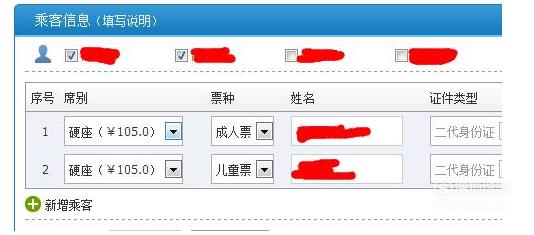 你只要在2个姓名前打上勾,就表示你同时购买两张一模一样的票,一张是成人票,一张是儿童票;打了勾之后,会出现如下图所示界面,你只要将相关信息如实填好,点击“提交订单”后网上支付。
