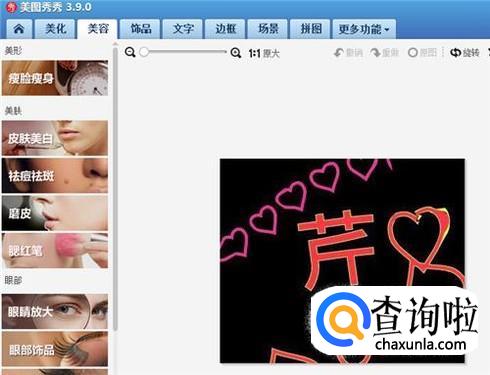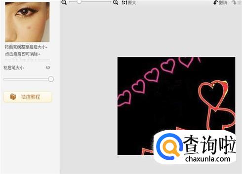 选择祛痘祛斑功能后,将左面的祛痘笔大小调整到自己想要的大小,然后将光标放在图片中的字上面,点击一下之后,芹字左下角的撇就不见了。