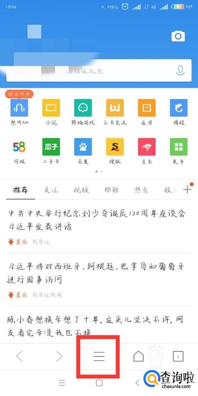 打开QQ浏览器后,点击页面下方中间的图标(有三条杠的图标)。