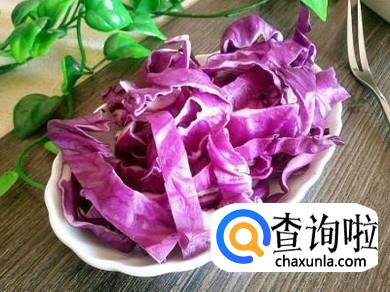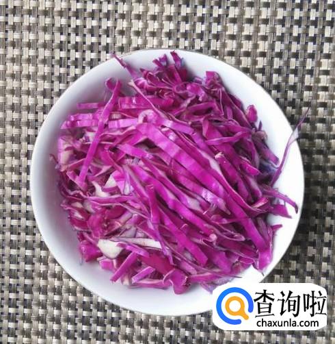 紫甘蓝掰开,洗净,切成丝状,放入盘中