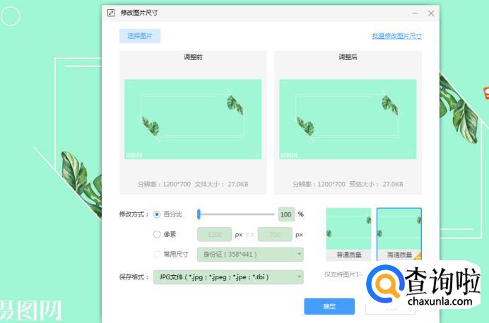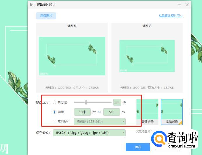 有多种调整方式可以选择。可以在调整选项中输入自己想要的数据值。还可以在上方看到前后的对比图。如图所示,小编调整了像素。选择好以后,点击确定。