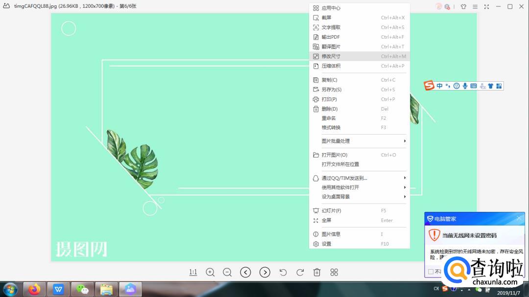 首先双击打开要打印的图片,单击鼠标右键,然后修改图片尺寸。