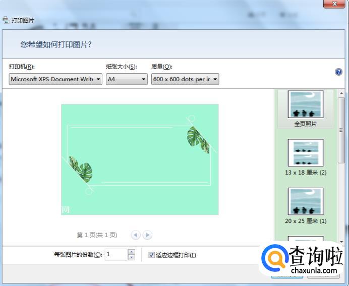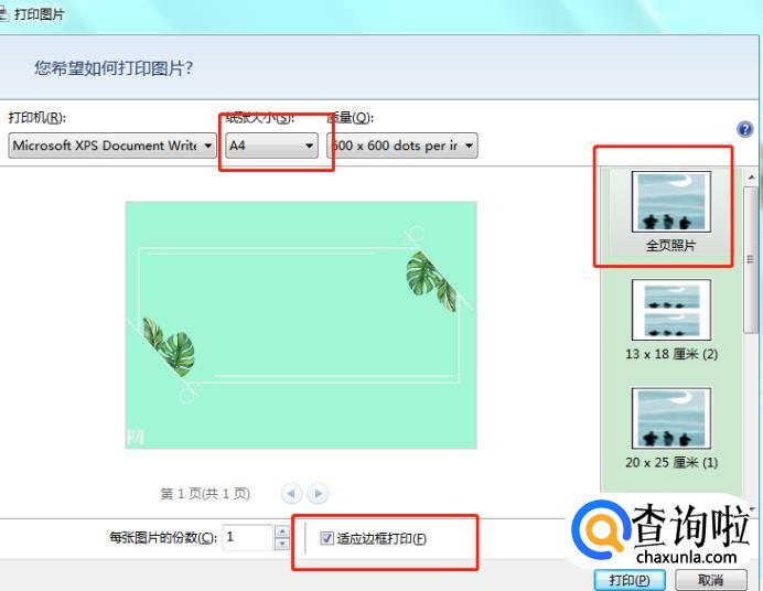 默认是选择A4格式,然后选择全页照片,以及适应边框打印,这里可以根据需要 进行选择。选择好以后点击确认就可以了。